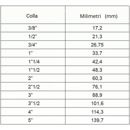 Skaties tabulā collu izmēru atbilstību milimetros: